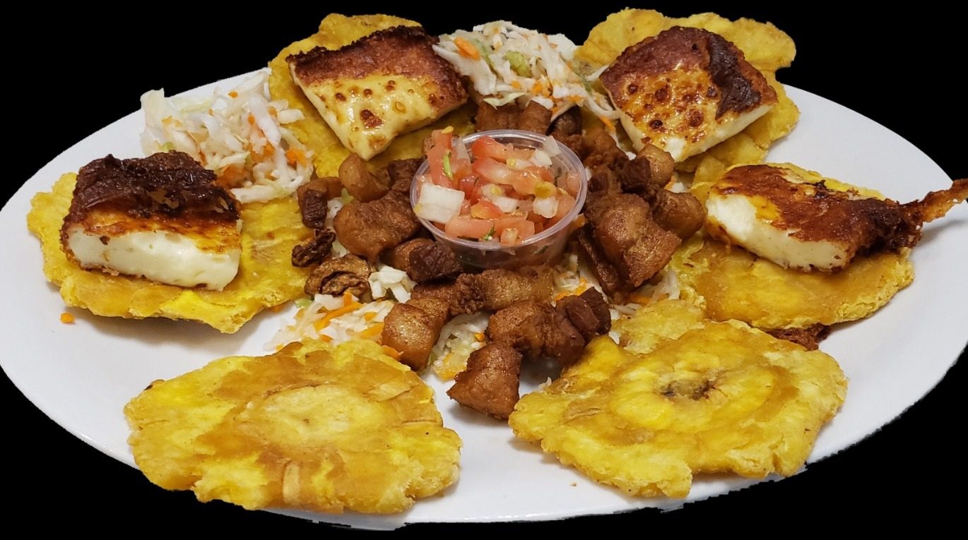 Boquita de Tostones con chicharones de puerco, queso frito, Chirimol y repollo al limon (Fried green platains, fried pork, fried cheese, pico de gallo and cabbage in lemon.