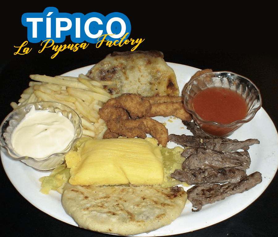 Cheese, pork and beans pupusa, grill beef, chicken fingers, sweet corn tamal, french fries, cream and tomatoes sauce.